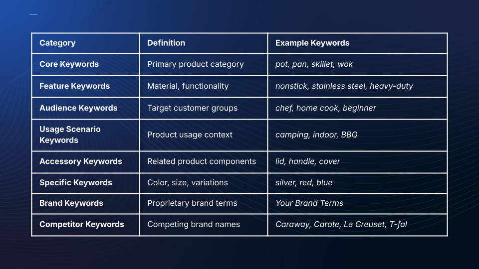 Keywords can also be categorized based on spend, ACoS, and conversion performance, allowing brands to adjust bidding strategies efficiently.